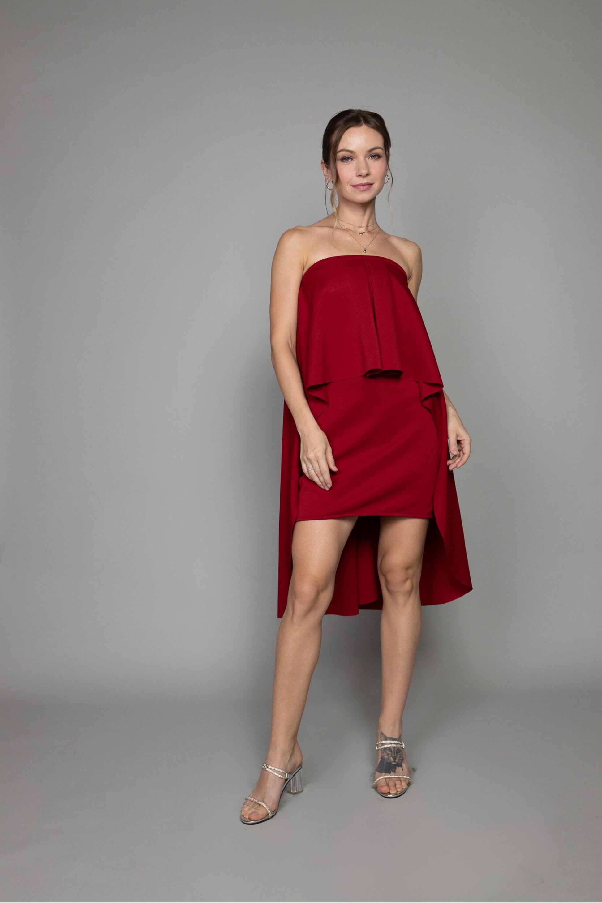 - Strapless dress with a cascading high-low hem, creating an effortlessly chic and dynamic look.