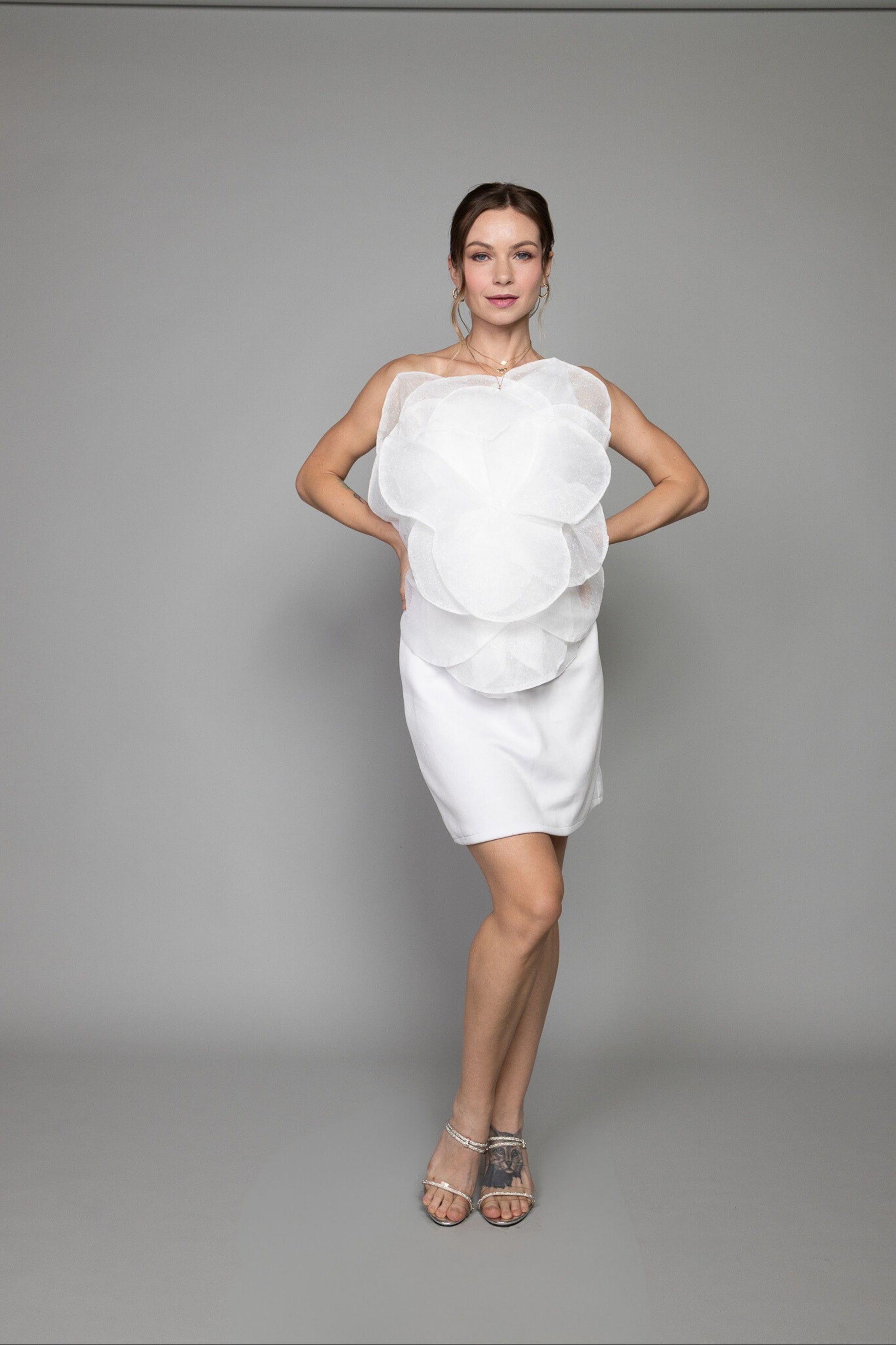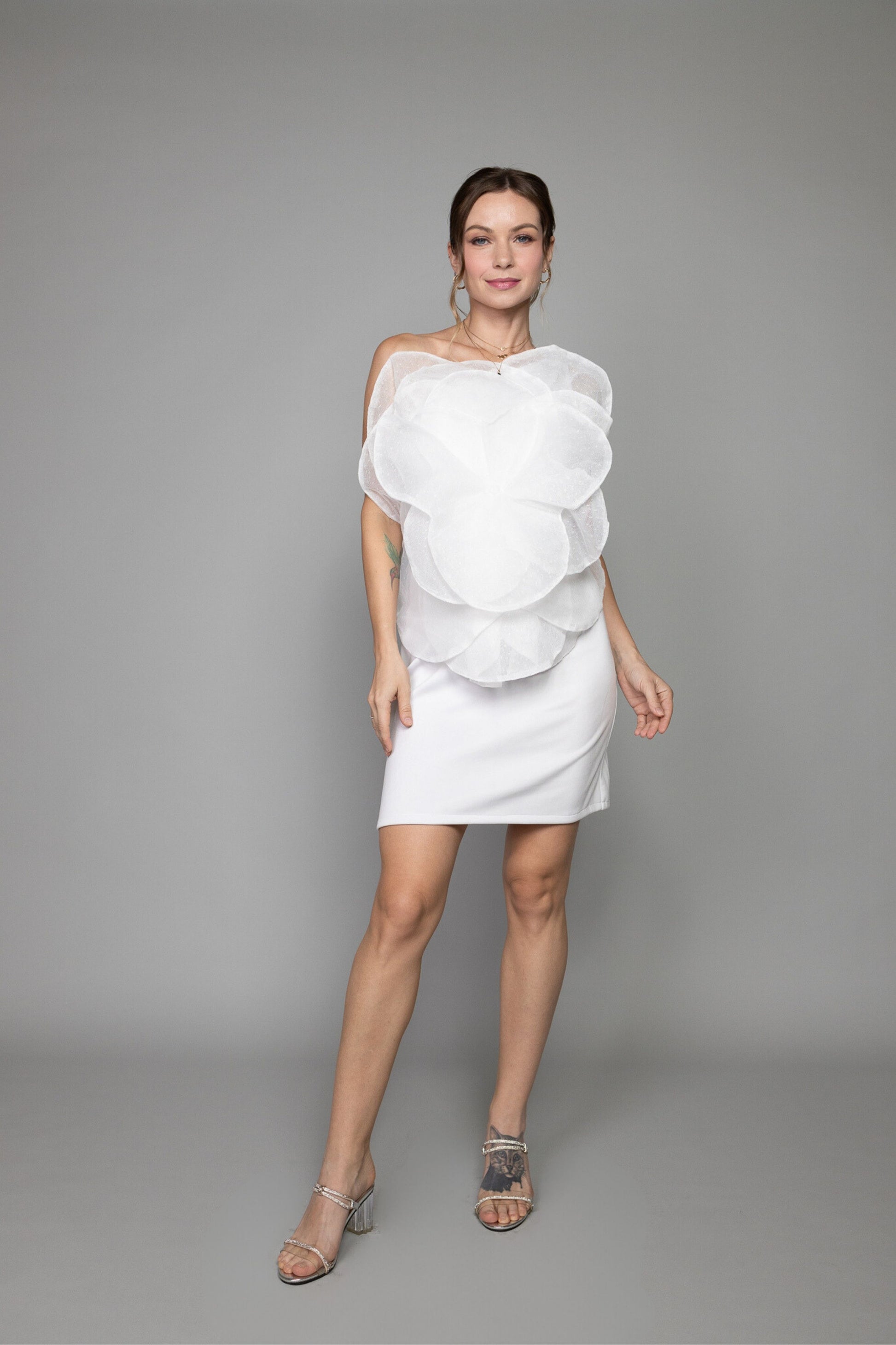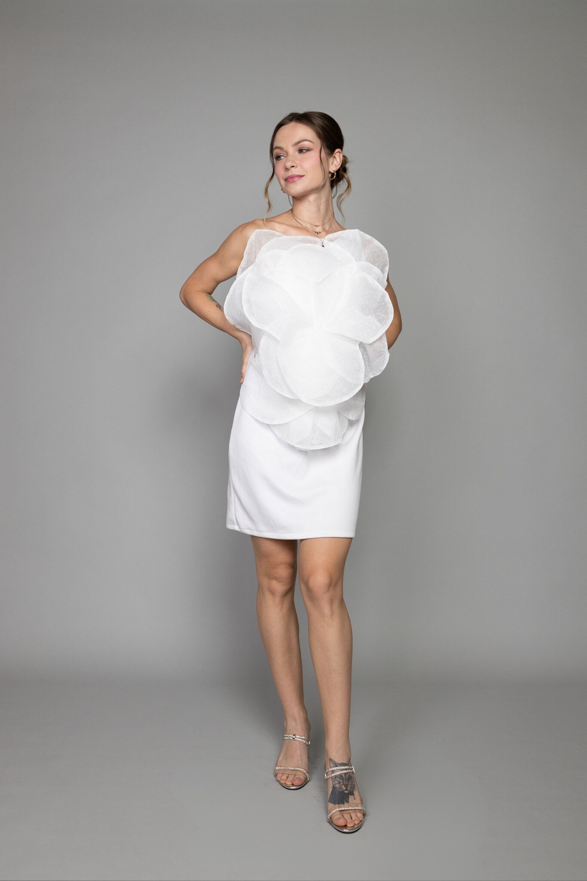 - Modern sleeveless mini dress with oversized floral applique detail.