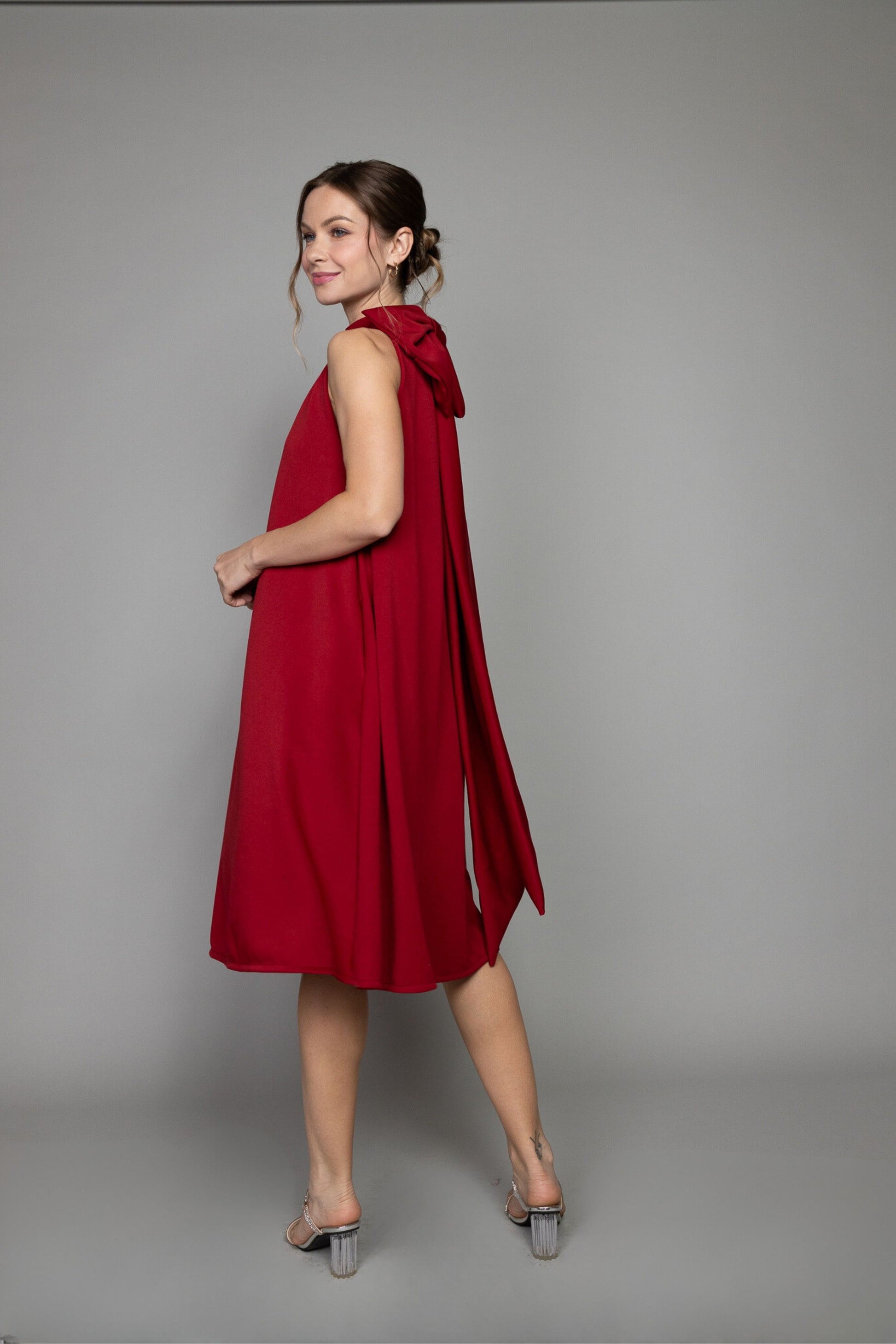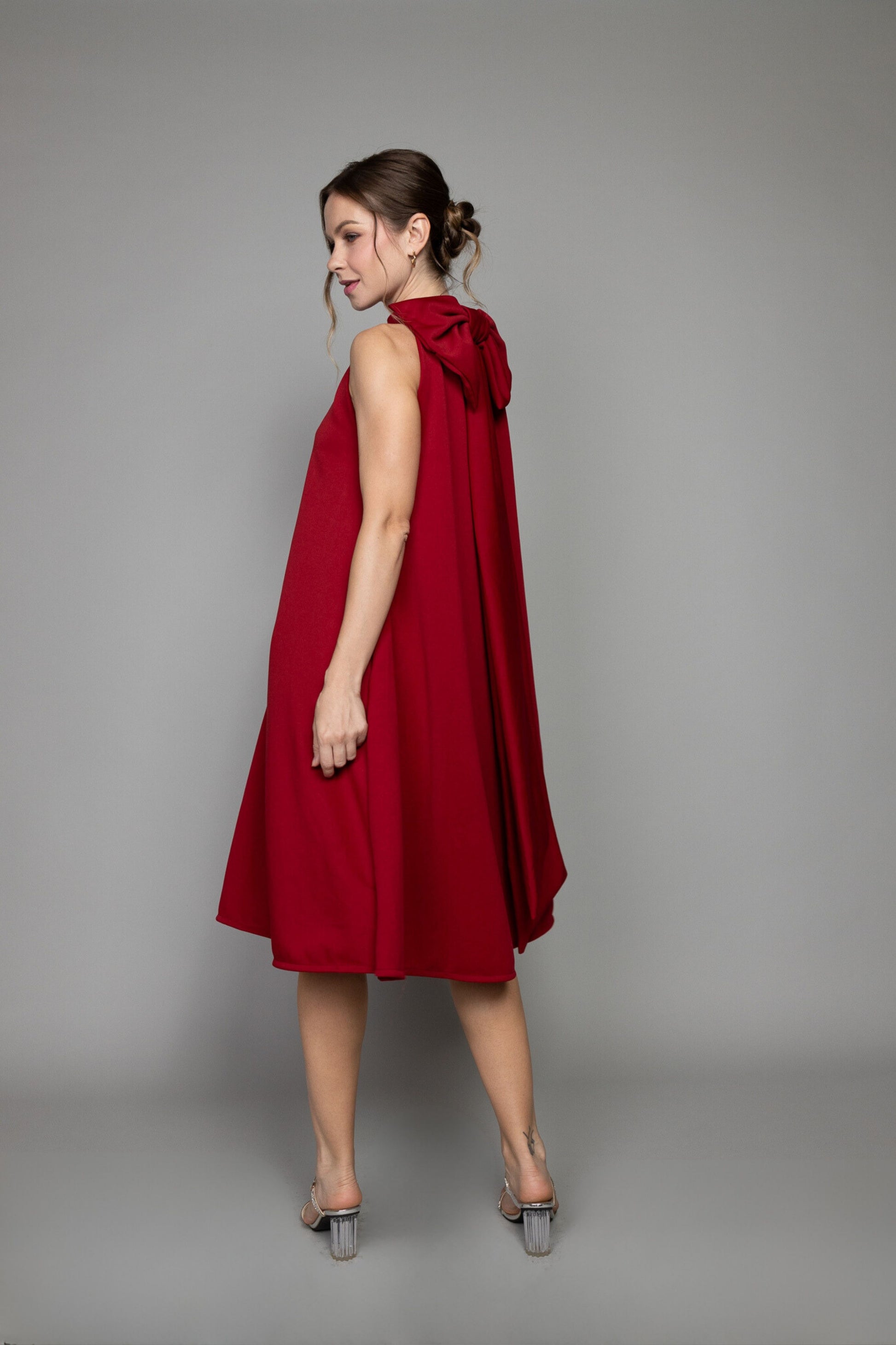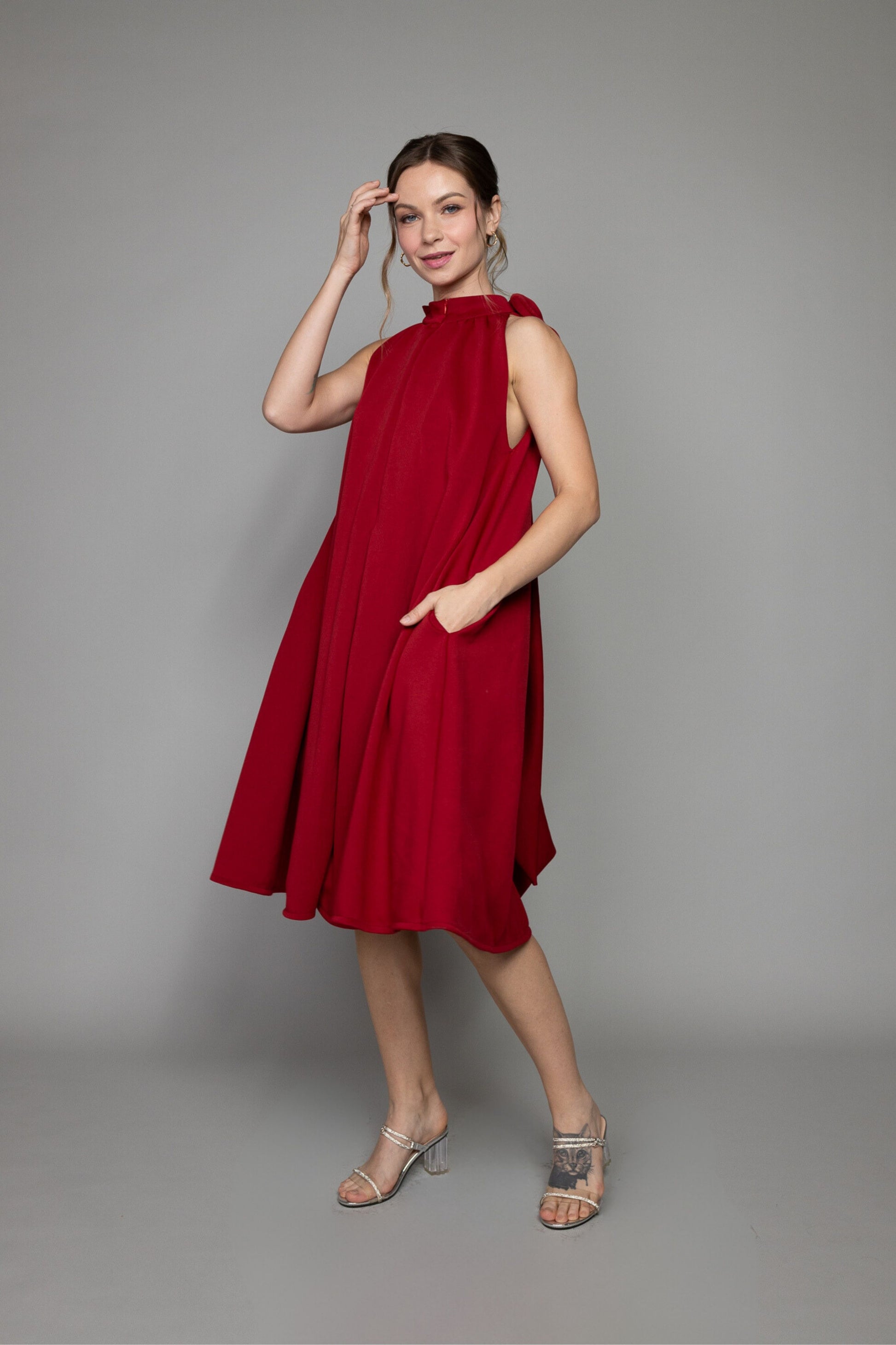 - Swingy, A-line halter dress with a high neckline and bow-tie detail.