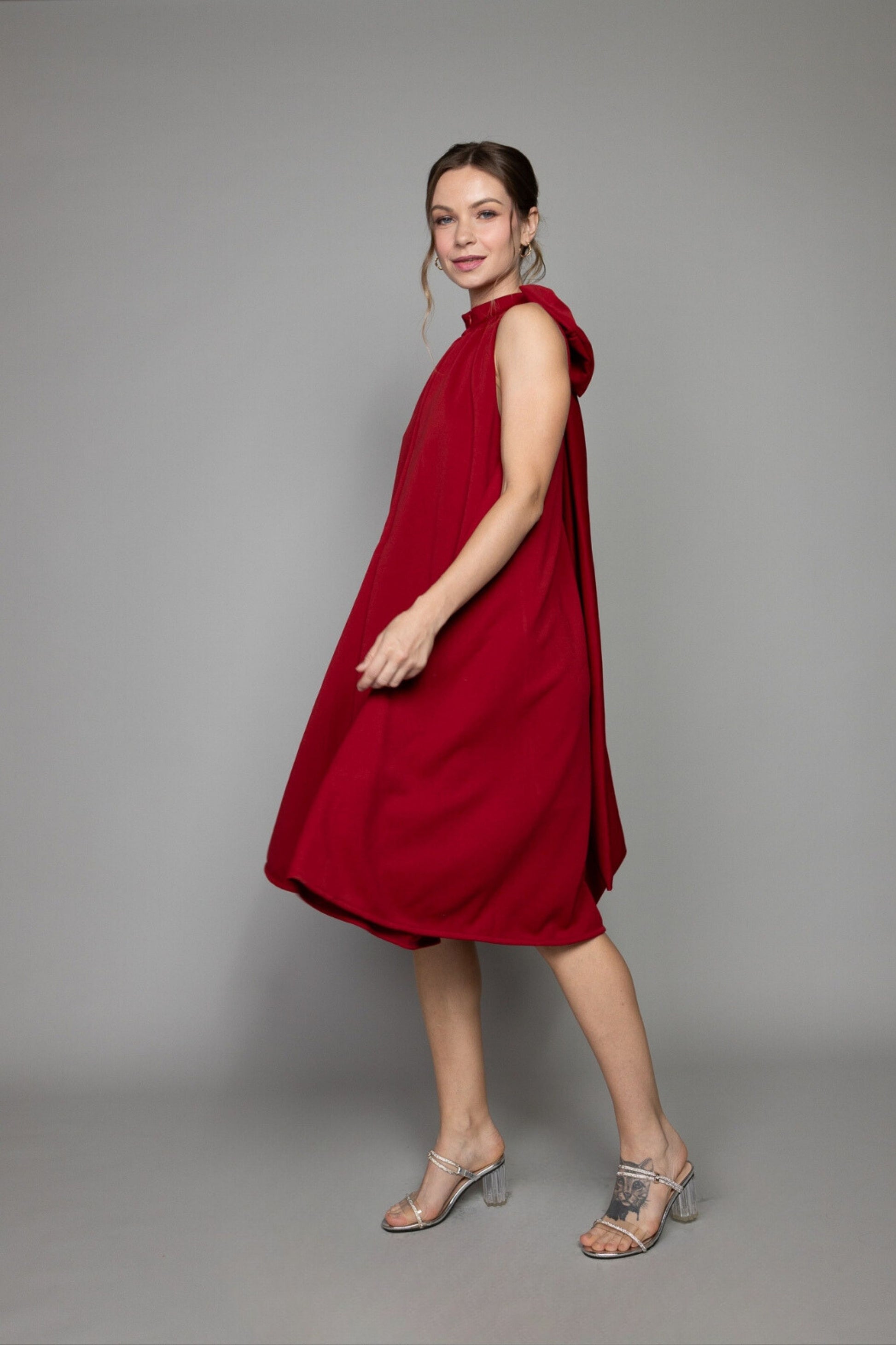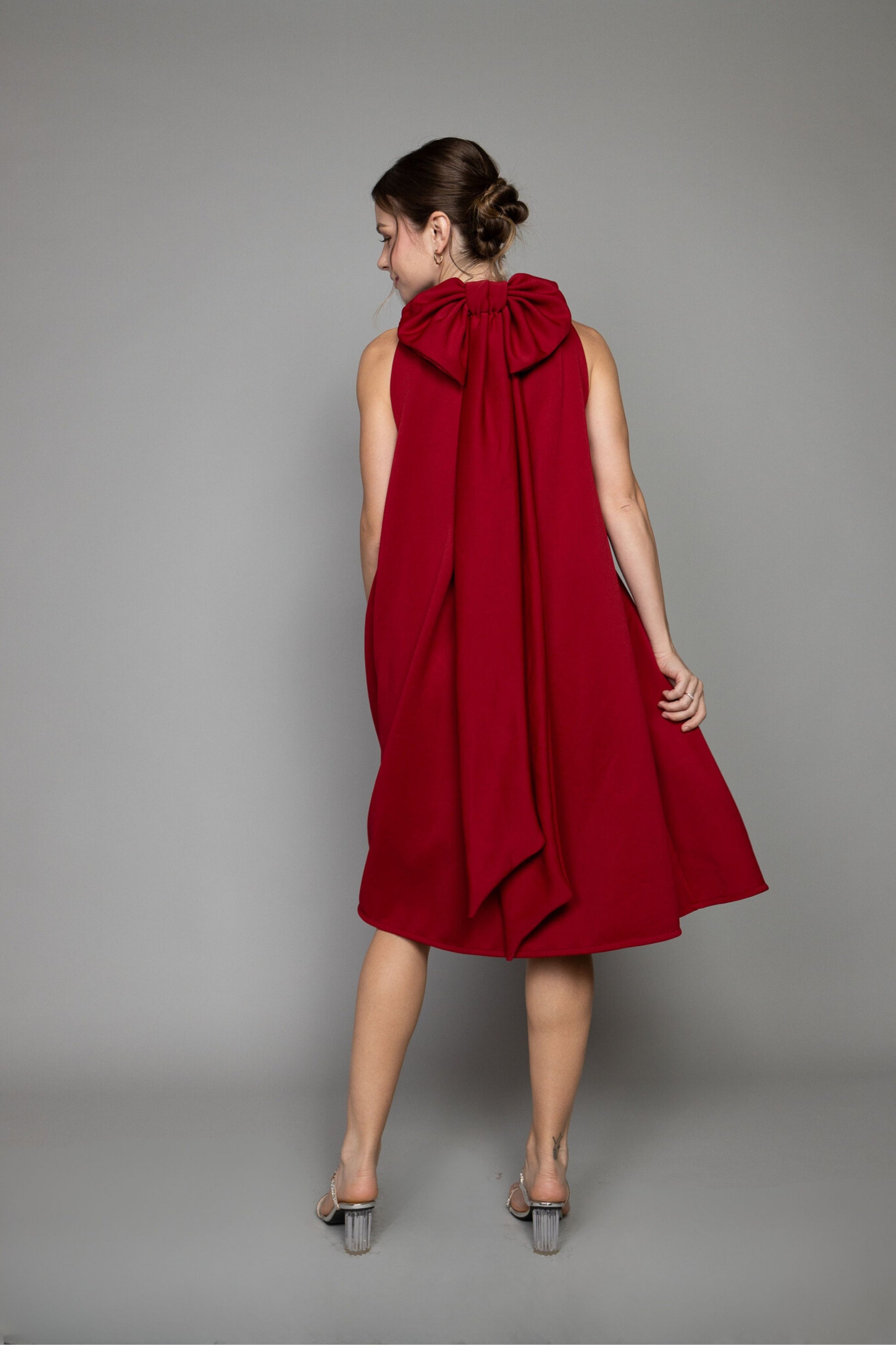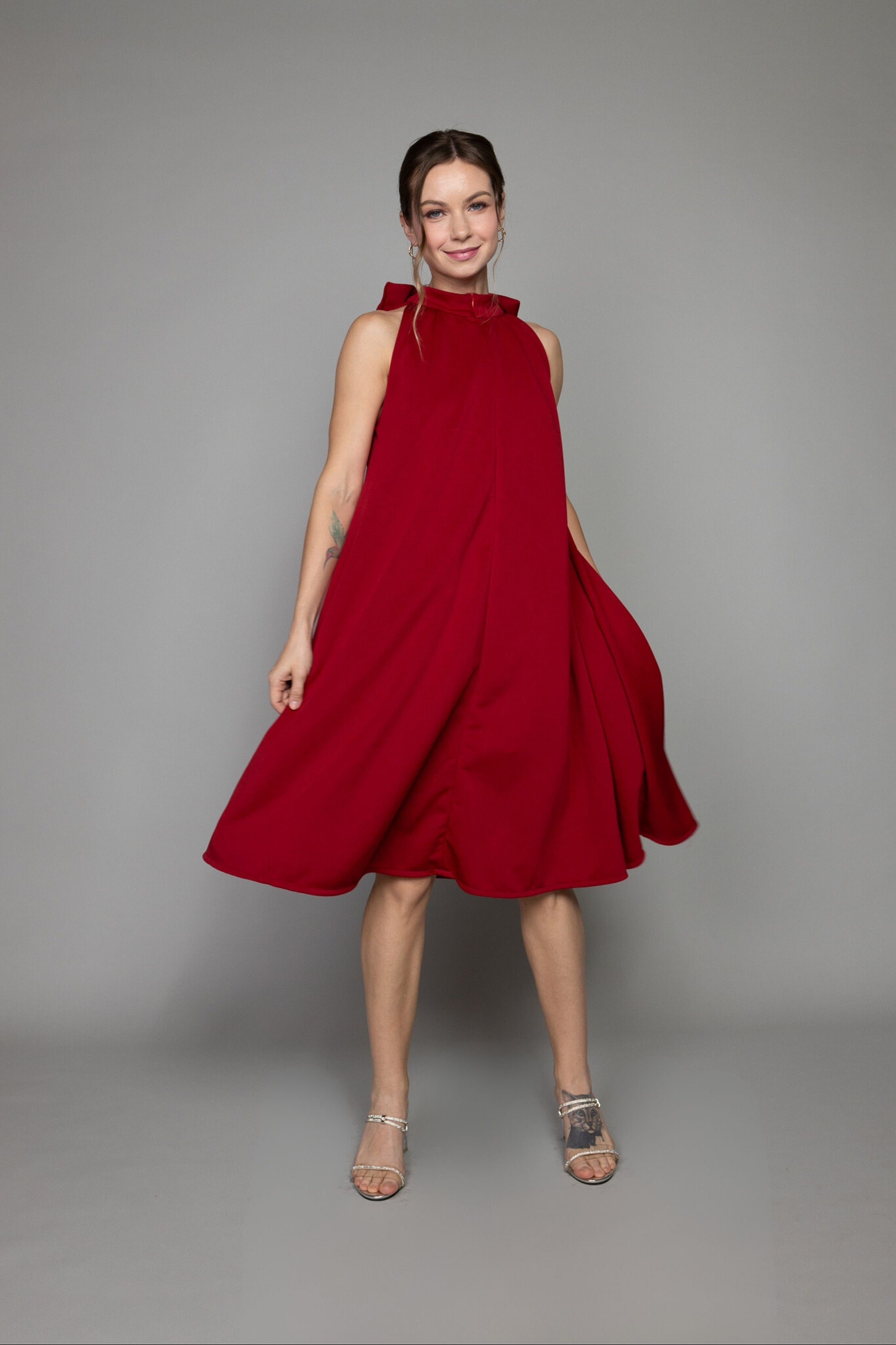 - Swingy, A-line halter dress with a high neckline and bow-tie detail.