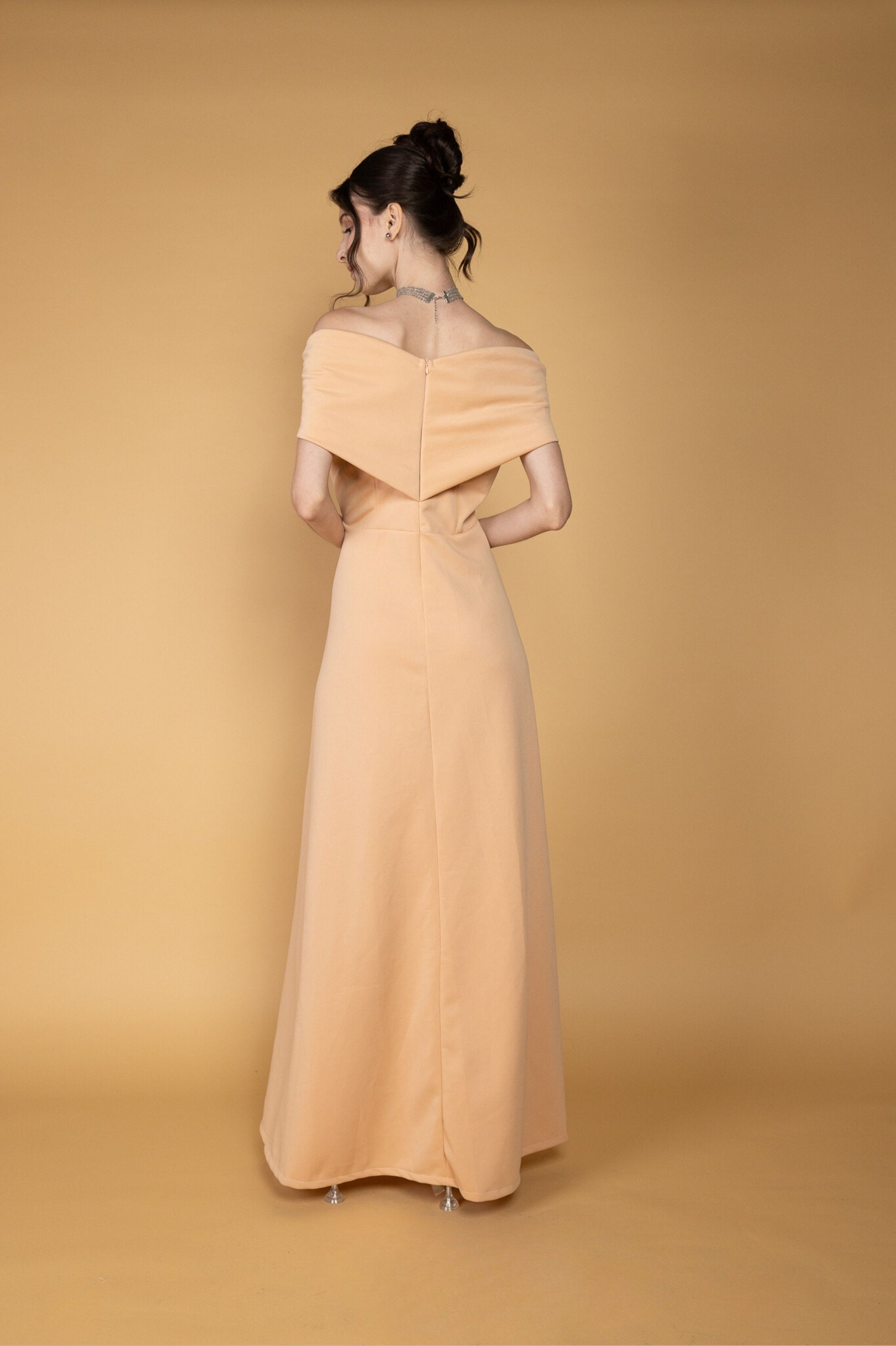 - Details: Fitted bodice transitioning into a gently flared skirt for a graceful silhouette .Wide, folded neckline adds a sophisticated touch.