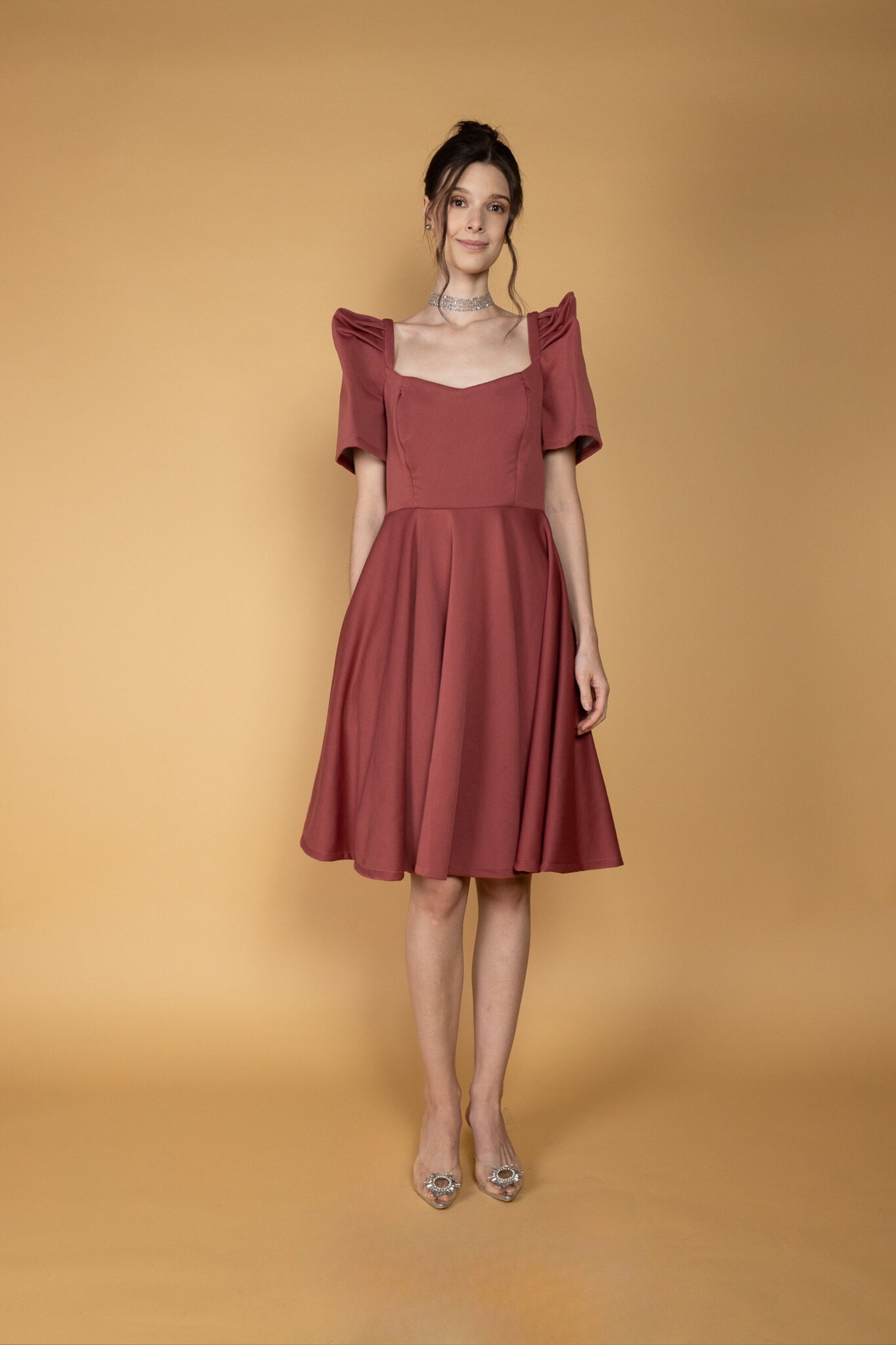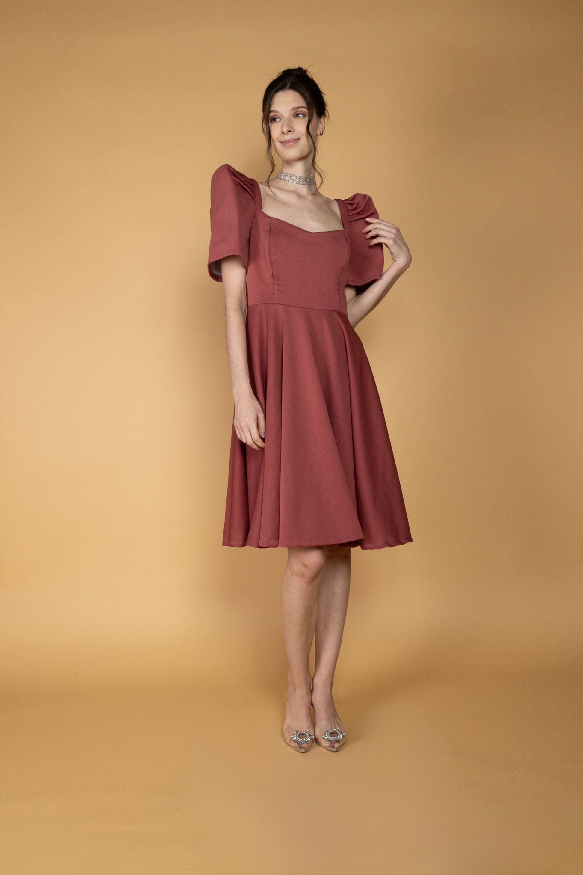 - Design: Elegant A-line dress with a flattering square neckline and puffed short sleeves for a timeless and feminine look.