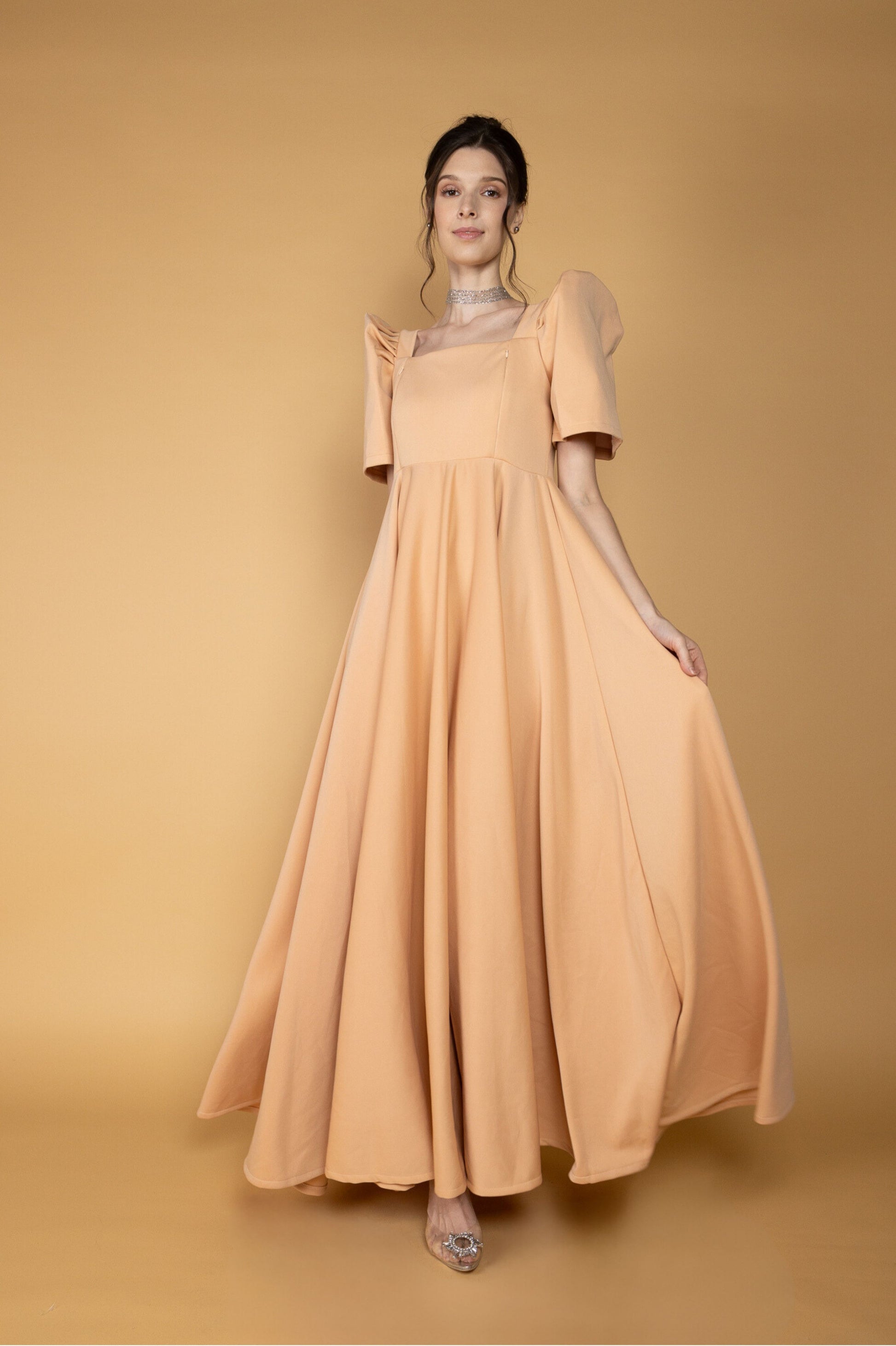 - Details: Square neckline and puffed short sleeves add a touch of timeless elegance.
