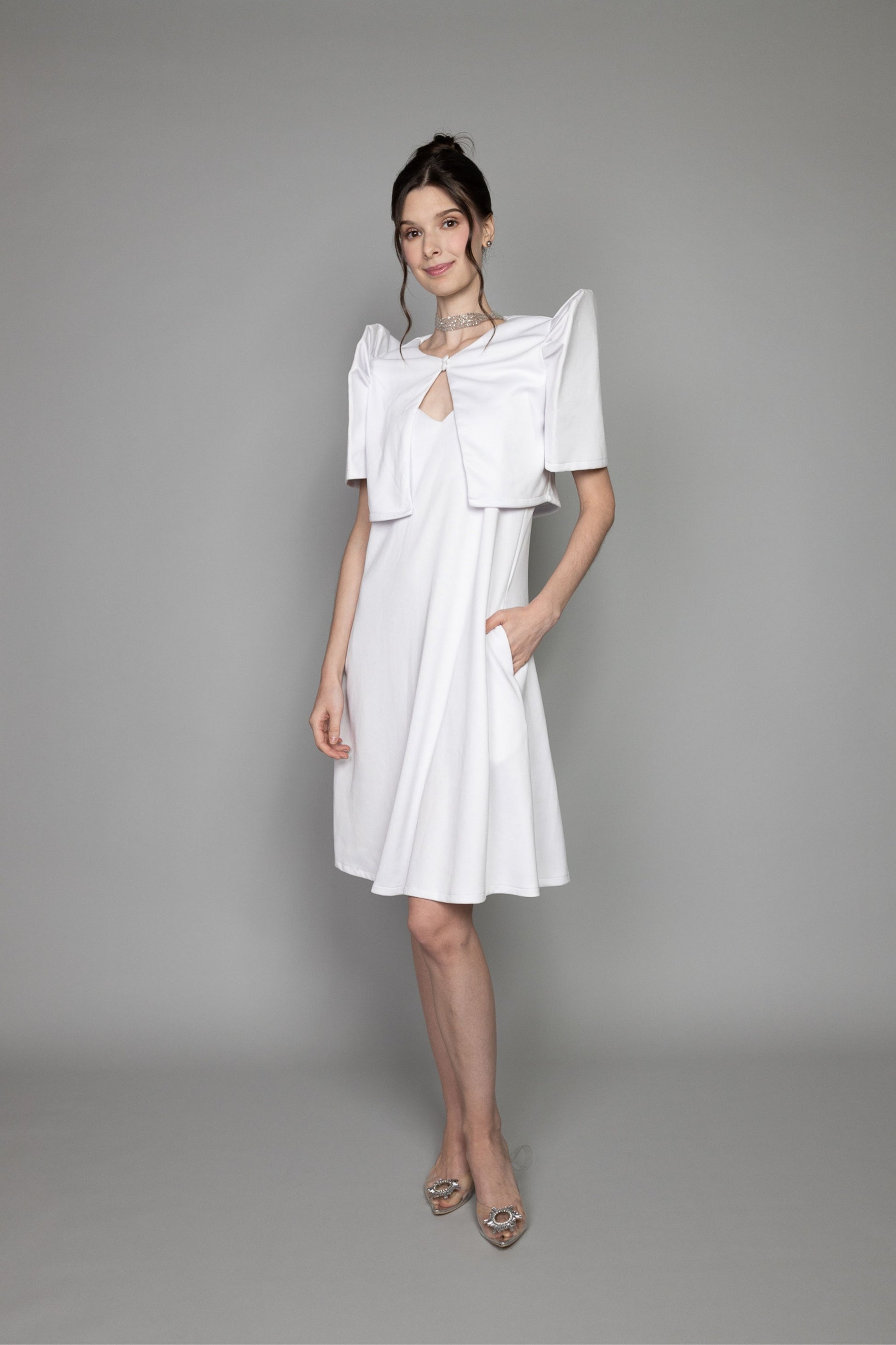 - Details: Includes a structured bolero-style overlay with slight puff shoulders for a modern touch.
