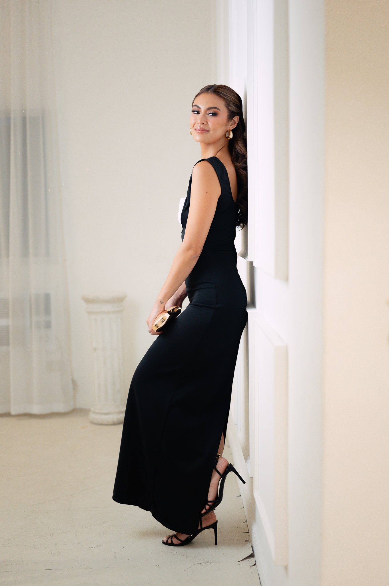 • Sleek and sophisticated floor-length gown with a color-blocked design
